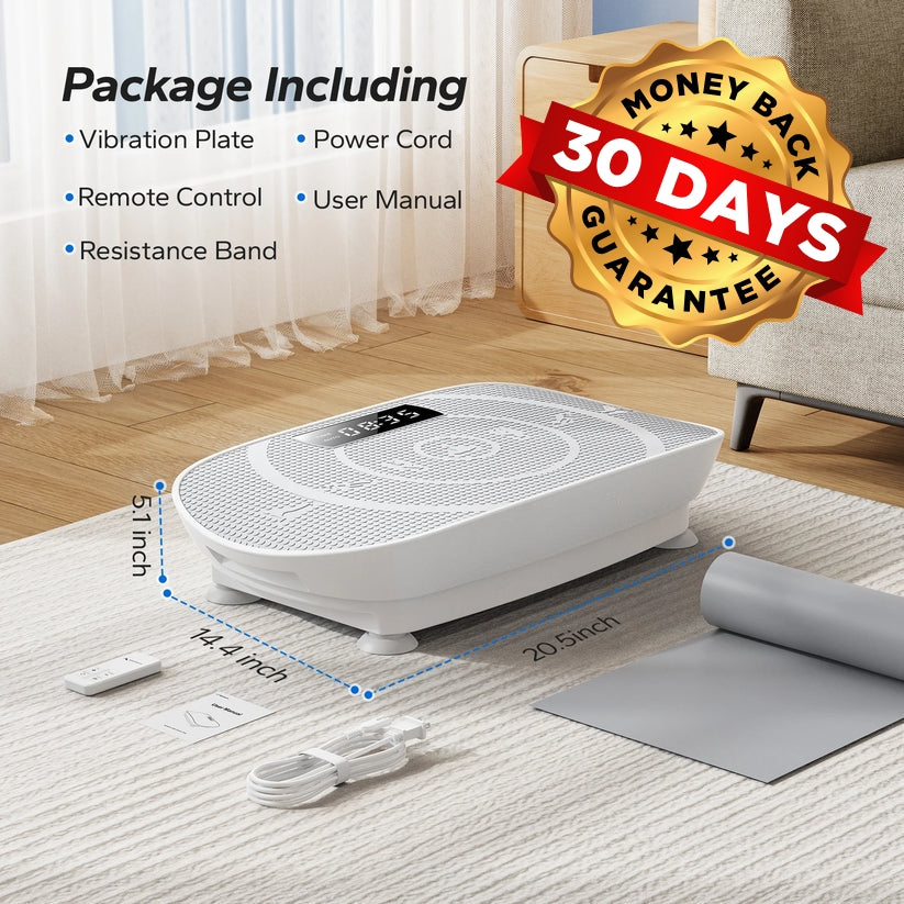 What You Get: 1 Revolutionary Vibration Fitness Platform™, 1 Power Adapter, 1 Safety Mat, 1 User Manual.